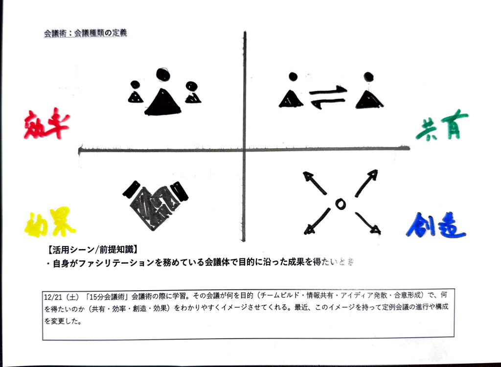 村上さん自身がファシリテーションを務める会議で、目的を共有する際に活用した考え方やイメージをまとめた図とキーワード